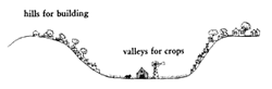 The land which is best for agriculture happens to be best for building too. But it is limited and once destroyed, it cannot be regained for centuries. In the last few years, suburban growth has been spreading over all land, agricultural or not. It eats up this limited resource and, worse still, destroys the possibility of farming close to cities once and for all. But we know, from the arguments of City Country Fingers (3), that it is important to have open farmland near the places where people live. Since the arable land which can be used for farming lies mainly in the valleys, it is essential that the valley floors within our urban regions be left untouched and kept for farming. The most complete study of this problem that we know, comes from Ian McHarg (Design With Nature, New York: Natural History Press, 1969). In his "Plan for the Valleys" (WallaceMcHarg Associates, Philadelphia, 1963), he shows how town development can be diverted to the hillsides and plateaus, leaving the valleys clear. The pattern is supported, also, by the fact that there are several possible practical approaches to the task of implementation (McHarg, pp. 79-93). Therefore: Preserve all agricultural valleys as farmland and protect this land from any development which would destroy or lock up the unique fertility of the soil. Even when valleys are not cultivated now, protect them: keep them for farms and parks and wilds.
