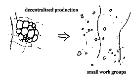 The only pattern of work which does justice to these requirements is a pattern of scattered work: a pattern in which work is strongly decentralized. To protect the neighborhoods from the noise and traffic that workplaces often generate, some noisy work places can be in the boundaries of neighborhoods, communities and subcultures - see Subculture Boundary (3); others, not noisy or noxious, can be built right into homes and neighborhoods. In both cases, the crucial fact is this: every home is within a few minutes of dozens of workplaces. Then each household would have the chance to create for itself an intimate ecology of home and work: all its members have the option of arranging a workplace for themselves close to each other and their friends. People can meet for lunch, children can drop in, workers can run home. And under the prompting of such connections the workplaces themselves will inevitably become nicer places, more like homes, where life is carried on, not banishe d for eight hours. This pattern is natural in traditional societies, where workplaces are relatively small and households comparatively self-sufficient. But is it compatible with the facts of high technology and the concentration of workers in factories? How strong is the need for workplaces to be near each other? The main argument behind the centralization of plants, and their gradual increase in size, is an economic one. It has been demonstrated over and again that there are economies of scale in production, advantages which accrue from producing a huge number of goods or services in one place. However, large centralized organizations are not intrinsic to mass production. There are many excellent examples which demonstrate the fact that where work is substantially scattered, people can still produce goods and services of enormous complexity. One of the best historical examples is the Jura Federation of watchmakers, formed in the mountain villages of Switzerland in the early 1870's. These workers produced watches in their home workshops, each preserving his independence while coordinating his efforts with other craftsmen from the surrounding villages. (For an account of this federation, see, for example, George Woodcock, Anarchism: A History of Libertarian Ideas and Movements,Cleveland: Meridian Books, 1962, pp. 168-69.) In our own time, Raymond Vernon has shown that small, scattered workplaces in the New York metropolitan economy, respond much faster to changing demands and supplies, and that the degree of creativity in agglomerations of small businesses is vastly greater than that of the more cumbersome and centralized industrial giants. (See Raymond Vernon, Metropolis,1985, Chapter 7: External Economics.) To understand these facts, we must first realize that the city itself is a vast centralized workspace and that all the benefits of this centralization are potentially available to every work group that is a part of the city's vast work community. In effect, the urban region as a whole acts to produce economies of scale by bringing thousands of work groups within range of each other. If this kind of "centralization" is properly developed, it can support an endless number of combinations between small, scattered workgroups; and it can lend great flexibility to the modes of production. "Once we understand that modern industry does not necessarily bring with it financial and physical concentration, the growth of smaller centers and a more widespread distribution of genuine benefits of technology will, I think, take place" (Lewis Mumford, Sticks and Stones,New York, 1924, p. 216). Remember that even such projects as complicated and seemingly centralized as the building of a bridge or a moon rocket, can be organized this way. Contracting and subcontracting procedures make it possible to produce complicated industrial goods and services by combining the efforts of hundreds of small firms. The Apollo project drew together more than 30,000 independent firms to produce the complicated spaceships to the moon. Furthermore, there is evidence that the agencies which set up such multiple contracts look for small, semi-autonomous firms. They know instinctively that the smaller, more self-governing the group, the better the product and the service (Small Sellers and Large Buyers in American Industry,Business Research Center, College of Business Administration, Syracuse University, New York, 1961). Let us emphasize: we are not suggesting that the decentralization of work should take precedence over a sophisticated technology. We believe that the two are compatible: it is possible to fuse the human requirements for interesting and creative work with the exquisite technology of modern times. It is possible to make television sets, xerox machines and IBM typewriters, automobiles, stereo sets and washing machines under human working conditions. We mention in particular the xerox and IBM typewriters because they have played a vital role for us, the authors of this book. We could not have made this book together, in the communal way we have done, without these machines: and we consider them a vital part of the new decentralized society we seek.