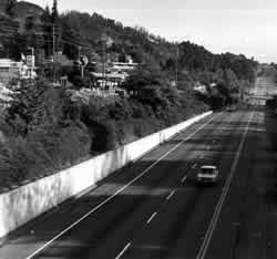 It is not possible to avoid the need for high speed roads in modern society; but it is essential to place them and build them in such a way that they do not destroy communities or countryside. Even though the rush of freeways and superhighways built in the 1950's and 1960's is slowing down, because of widespread local protest, we cannot avoid high speed roads altogether. There is, at present, no prospect for a viable alternative which can provide for the vast volume of movement of cars and trucks and buses which a modern city lives on economically and socially. At the same time, however, high speed roads do enormous damage when they are badly placed. They slice communities in half; they cut off waterfronts; they cut off access to the countryside; and, above all, they create enormous noise. For hundreds of yards, even a mile or two, the noise of every superhighway roars in the background. To resolve these obvious dilemmas? that come with the location and construction of high speed roads, we must find ways of building and locating these roads, so that they do not destroy communities and shatter life with their noise. We can give three requirements that, we believe, go to the heart of this policy: 1. Every community that has coherence as an area of local transportation - Local Transport Areas (16) - is never split by a high speed road, but rather has at least one high speed road adjacent to it. This allows rapid auto travel from one such community out to other communities and to the region at large. 2. It must be possible for residents of each local transport area to reach the open countryside without crossing a high speed road - see City Country Fingers (3). This means, very roughly, that high speed roads must always be placed in such positions that at least one side of every local transport area has direct access to open country. 3. Most important of all, high speed roads must be shielded acoustically to protect the life around them. This means that they must either be sunken, or shielded by earth berms, parking structures, or warehouses, which will not be damaged by the noise.