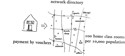 There is no need to add to the criticism of our public schools. The critique is extensive and can hardly be improved on. The processes of learning and teaching, too, have been exhaustively studied.... The question now is what to do. (George Dennison, Lives of Children, New York: Vintage Books, 1969, p. 3.) To date, the most penetrating analysis and proposal for an alternative framework for education comes from Ivan Illich in his book, De-Schooling Society, and his article, "Education without Schools: How It Can Be Done," in the New York Review of Books,New York, 15 (12 ): 25-31, special supplement, July 1971. Illich describes a style of learning that is quite the opposite from schools. It is geared especially to the rich opportunities for learning that are natural to every metropolitan area: The alternative to social control through the schools is the voluntary participation in society through networks which provide access to all its resources for learning. In fact these networks now exist, but they are rarely used for educational purposes. The crisis of schooling, if it is to have any positive consequence, will inevitably lead to their incorporation into the educational process.... Schools are designed on the assumption that there is a secret to everything in life; that the quality of life depends on knowing that secret; that secrets can be known only in orderly successions; and that only teachers can properly reveal these secrets. An individual with a schooled mind conceives of the world as a pyramid of classified packages accessible only to those who carry the proper tags.New educational institutions would break apart this pyramid. Their purpose must be to facilitate access for the learner: to allow him to look into the windows of the control room or the parliament, if he cannot get in the door.Moreover, such new institutions should be channels to which the learner would have access without credentials or pedigree‹public spaces in which peers and elders outside his immediate horizon now become available.... While network administrators would concentrate primarily on the building and maintenance of roads providing access to resources, the pedagogue would help the student to find the path which for him could lead fastest to his goal. If a student wants to learn spoken Cantonese from a Chinese neighbor, the pedagogue would be available to judge their proficiency, and to help them select the textbook and methods most suitable to their talents, character, and the time available for study. He can counsel the would-be airplane mechanic on finding the best places for apprenticeship. He can recommend books to somebody who wants to find challenging peers to discuss African history. Like the network administrator, the pedagogical counselor conceives of himself as a professional educator. Access to either could be gained by individuals through the use of educational vouchers. In addition to the tentative conclusions of the Carnegie Commission reports, the last year has brought forth a series of important documents which show that responsible people are becoming aware of the fact that schooling for certification cannot continue to be counted upon as the central educational device of a modern society. Julius Nyere of Tanzania has announced plans to integrate education with the life of the village. In Canada, the Wright Commission on post-secondary education has reported that no known system of formal education could provide equal opportunities for the citizens of Ontario. The president of Peru has accepted the recommendation of his commission on education, which proposes to abolish free schools in favor of free educational opportunities provided throughout life. In fact he is reported to have insisted that this program proceed slowly at first in order to keep teachers in school and out of the way of true educators. (Abridged from pp. 76 and 99 in Deschooling Societyby Ivan Il lich. Vol. 44 in World Perspectives Series, edited by Ruth Nanda Anshen, New York: Harper & Row, 197I.) In short, the educational system so radically decentralized becomes congruent with the urban structure itself. People of all walks of life come forth, and offer a class in the things they know and love: professionals and workgroups offer apprenticeships in their offices and workshops, old people offer to teach whatever their life work and interest has been, specialists offer tutoring in their special subjects. Living and learning are the same. It is not hard to imagine that eventually every third or fourth household will have at least one person in it who is offering a class or training of some kind. Therefore: Instead of the lock-step of compulsory schooling in a fixed place, work in piecemeal ways to decentralize the process of learning and enrich it through contact with many places and people all over the city: workshops, teachers at home or walking through the city, professionals willing to take on the young as helpers, older children teaching younger children, museums, youth groups traveling, scholarly seminars, industrial workshops, old people, and so on. Conceive of all these situations as forming the backbone of the learning process; survey all these situations, describe them, and publish them as the city's "curriculum"; then let students, children, their families and neighborhoods weave together for themselves the situations that comprise their "school" paying as they go with standard vouchers, raised by community tax. Build new educational facilities in a way which extends and enriches this network.