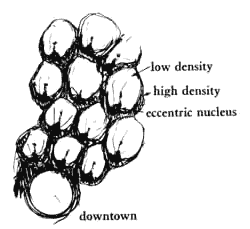These rules are rather simple. If we follow them, we shall find a beautiful gradient of overlapping imbricated horseshoes, not unlike the scales of a fish. If the city gradually gets this highly coherent structure, then we can be sure that the articulation of dense areas, and areas of little density, will be so clear that both activity and quiet can exist, each intense, unmixed, and each available to everyone. Therefore: Encourage growth and the accumulation of density to form a clear configuration of peaks and valleys according to the following rules: 1. Consider the town as a collection of communities of 7000. These communities will be between 1/4 mile across and 2 miles across, according to their overall density. 2. Mark that point in the boundary of each community which is closest to the nearest major urban center. This point will be the peak of the density, and the core of the "eccentric" nucleus. 3. Allow the high density to bulge in from the boundary, toward the center of gravity of the community, thus enlarging the eccentric nucleus toward the center. 4. Continue this high density to form a ridge around the boundary in horseshoe fashion with the length of the horseshoe dependent on the overall mean gross density, at that part of the city, and the bulge of the horseshoe toward the center of the region, so that the horseshoes form a gradient, according to their position in the region. Those close to a major downtown are almost complete; those further away are only half complete; and those furthest from centers are shrunken to a point. Given this overall configuration, now calculate the average densities at different distances from this ridge of high density, according to the computations given in the next pattern Density Rings (29); keep major shopping streets and promenades toward the dense part of the horseshoe - Activity Nodes (30), Promenade (31), Shopping Street (32); and keep quiet areas toward the open part of the horseshoe - Sacred Sites (24), Quiet Backs (59), Still Water (71)....