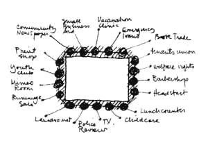 The local town hall will not be an honest part of the community which lives around it, unIess it is itself surrounded by all kinds of small community activities and projects, generated by the people for themselves. A lively process of community self-government depends on an endless series of ad hoc political and service groups, functioning freely, each with a proper chance to test its ideas before the townspeople. The spatial component of this idea is crucial: this process will be stymied if people cannot get started in an office on a shoestring. We derive the geometry of this pattern from five requirements: 1. Small, grass roots movements, unpopular at their inception, play a vital role in society. They provide a critical opposition to established ideas; their presence is a direct correlate of the right to free speech; a basic part of the self-regulation of a successful society, which will generate counter movements whenever things get off the track. Such movements need a place to manifest themselves, in a way which puts their ideas directly into the public domain. At this writing, a quick survey of the East Bay shows about 30 or 40 bootstrap groups that are suffering for lack of such a place: for example, Alcatraz Indians, Bangla Desh Relief, Solidarity Films, Tenant Action Project, November 7th Movement, Gay Legal Defense, No on M, People's Translation Service. . . . 2. But as a rule these groups are small and have very little money. To nourish this kind of activity, the community must provide minimal space to any group of this sort, rent free, with some limit on the duration of the lease. The space must be like a small storefront and have typewriters, duplicating machines, and telephones; and access to a meeting room. 3. To encourage the atmosphere of honest debate, these storefront spaces must be near the town hall, the main crossroads of public life. If they are scattered across the town, away from the main town hall, they cannot seriously contend with the powers that be. 4. The space must be highly visible. It must be built in a way which lets the group get their ideas across, to people on the street. And it must be physically organized to undermine the natural tendency town governments have to wall themselves in and isolate themselves from the community once they are in power. 5. Finally, to bring these groups into natural contact with the community, the fabric of storefronts should be built to include some of the stable shops and services that the community needs- barbershop, cafe, laundromat. These five requirements suggest a necklace of rather open storefront spaces around the local town hall. This necklace of spaces is a physical embodiment of the political process in an open society: everyone has access to equipment, space to mount a campaign, and the chance to get their ideas into the public arena. Therefore: Allow the growth of shop-size spaces around the local town hall, and any other appropriate community building. Front these shops on a busy path, and lease them for a minimum rent to ad hoc community groups for political work, trial services, research, and advocate groups. No ideological restrictions.