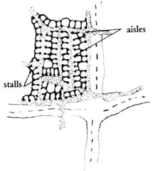 A spectacular example of a simple wood structure that has been modified and enlarged over the years is the Pike Place Market in Seattle, Washington. The Pike Place Market - a market of many shops in Seattle. Therefore: Instead of modern supermarkets, establish frequent marketplaces, each one made up of many smaller shops which are autonomous and specialized (cheese, meat, grain, fruit, and so on). Build the structure of the market as a minimum, which provides no more than a roof, columns which define aisles, and basic services. Within this structure allow the different shops to create their own environment, according to their individual taste and needs. Make the aisles wide enough for small delivery carts and for a dense throng of pedestrians perhaps 6 to 12 feet wide BUlLDING THOROUGHFARE (101); keep the stalls extremely small so that the rent is low perhaps no more than six feet by nine feet shops which need more space can occupy two - Individually Owned Shops (87); define the stalls with columns at the corners only - Columns at the Corners (212); perhaps even let the owners make roofs for themselves - Canvas Roofs (244); connect the aisles with the outside so that the market is a direct continuation of the pedestrian paths in the city just around it - Pedestrian Street (100). . . .