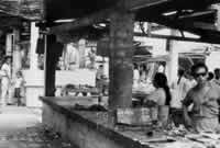 It is natural and convenient to want a market where all the different foods and household goods you need can be bought under a single roof. But when the market has a single management, like a supermarket, the foods are bland, and there is no joy in going there. It is true that the large supermarkets do have a great variety of foods. But this "variety', is still centrally purchased, centrally warehoused, and still has the staleness of mass merchandise. In addition, there is no human contact left, only rows of shelves and then a harried encounter with the check-out man who takes your money. The only way to get the human contact back, and the variety of food, and all the love and care and wisdom about individual foods which shopkeepers who know what they are selling can bring to it, is to create those markets once again in which individual owners sell different goods, from tiny stalls, under a common roof. As it stands, supermarkets are likely to get bigger and bigger, to conglomerate with other industries, and to go to all lengths to dehumanize the experience of the marketplace. Horn and Hardart, for example, have been contemplating this scheme: . . . the customer either drives her car or walks onto a moving ramp, is conveyed decorously through the whole store, selects her groceries by viewing samples displayed in lighted wall panels (or unlocking the cases with a special key or her credit card), and chooses her meat and produce via closed circuit TV. She then drives around to a separate warehouse area to collect her order, paid for by a universal credit card system.... Most of the people would be invisible. . . . (Jennifer Cross, The Supermarket Trap,New York: Berkeley Medallion, 1971) . Now contrast this with the following description of an old fashioned market place in San Francisco: If you visit the Market regularly you come to have favorite stalls, like the one with the pippin and Hauer apples from Watsonville. The farmer looks at each apple as he chooses it and places it in the bag, reminding you to keep them in a cool place so they will remain crisp and sweet. If you display interest, he tells you with pride about the orchard they come from and how they were grown and cared for, his blue eyes meeting yours. His English is spoken with a slight Italian accent so you wonder about the clear blue eyes, light brown hair and long-boned body until he tells you about the part of northern Italy where he was born. There is a handsome black man offering small mountains of melons where the stalls end. Tell him you are not enough of an expert to choose one you would like to have perfect for the day after tomorrow, and he will not only pick one out that he assures you will be just right (as it turns out to be), but gives you a lesson in choosing your next melon, whether cranshaw, honeydew or watermelon, wherever you may happen to buy it. He cares that you will always get a good one and enjoy it. ("The Farmers Go to Market," California Living,San Francisco Chronicle Sunday Magazine, February 6, 1972.) There is no doubt that this is far more human and enlivening than the supermarket conveyor belt. The critical question lies with the economics of the operation. Is there a reasonable economic basis for a marketplace of many shops? Or are markets ruled out by the efficiencies of the supermarket? There do not seem to be any economic obstacles more serious than those which accompany the start of any business. The major problem is one of coordination - coordination of individual shops to form one coherent market and coordination of many similar shops, from several markets, to make bulk purchase arrangements. If individual shops are well located, they can operate competitively, at profit margins of up to 5 per cent of sales ("Expenses in Retail Business," National Cash Register, Dayton, Ohio, p. 15). According to National Cash Register figures, this profit margin stays the same, regardless of size, for all convenience food stores. The small stores are often undercut by supermarkets because they are located by themselves, and therefore cannot offer shoppers the same variety at one stop, as the supermarket. However, if many of these small shops are clustered and centrally located, and together they offer a variety comparable to the supermarket, then they can compete effectively with the chain supermarkets. The one efficiency that chain stores do maintain is the efficiency of bulk purchase. But even this can be offset if groups of similar shops, all over the town, coordinate their needs and set up bulk purchase arrangements. For example, in the Bay Area there are a number of flower vendors running their business from small carts on the street. Although each vendor manages his own affairs independently, all the vendors go in together to buy their flowers. They gain enormously by purchasing their flowers in bulk and undersell the established florists three to one. Of course, it is difficult for a market of many shops to get started - it is hard to find a place and hard to finance it. We propose a very rough and simple structure in the beginning, that can be filled in and improved over time. The market in the photo, in Lima, Peru, began with nothing more than freestanding columns and aisles. The shops most of them no more than six feet by nine were built up gradually between the columns. A market in Peru . . .