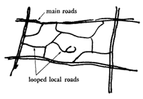 Therefore: Lay out local roads so that they form loops. A loop is defined as any stretch of road which makes it impossible for cars that don't have destinations on it to use it as a shortcut. Do not allow any one loop to serve more than 50 cars, and keep the road really narrow - 17 to 20 feet is quite enough.