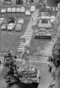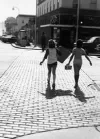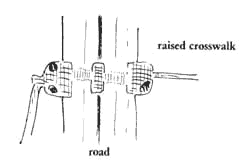 Where paths cross roads, the cars have power to frighten and subdue the people walking, even when the people walking have the legal right-of-way. This will happen whenever the path and the road are at the same level. No amount of painted white lines, crosswalks, traffic lights, button operated signals, ever quite manage to change the fact that a car weighs a ton or more, and will run over any pedestrian, unless the driver brakes. Most often the driver does brake. But everyone knows of enough occasions when brakes have failed, or drivers gone to sleep, to be perpetually wary and afraid. The people who cross a road will only feel comfortable and safe if the road crossing is a physical obstruction, which physically guarantees that the cars must slow down and give way to pedestrians. In many places it is recognized by law that pedestrians have the right-of-way over automobiles. Yet at the crucial points where paths cross roads, the physical arrangement gives priority to cars. The road is continuous, smooth, and fast, interrupting the pedestrian walkway at the junctions. This continuous road surface actually implies that the car has the right-of-way. What should crossings be like to accommodate the needs of the pedestrians The fact that pedestrians feel less vulnerable to cars when they are about 18 inches above them, is discussed in the next pattern Raised Walk (55). The same principle applies, even more powerfully, where pedestrians have to cross a road. The pedestrians who cross must be extremely visible from the road. Cars should also be forced to slow down when they approach the crossing. If the pedestrian way crosses 6 to 12 inches above the roadway, and the roadway slopes up to it, this satisfies both requirements. A slope of 1 in 6, or less, is safe for cars and solid enough to slow them down. To make the crossing even easier to see from a distance and to give weight to the pedestrian's right to be there, the pedestrian path could be marked by a canopy at the edge of the road - Canvas Roofs (244). Almost a road crossing . . . but no bump.