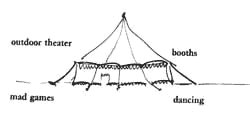 Just as an individual person dreams fantastic happenings to release the inner forces which cannot be encompassed by ordinary events, so too a city needs its dreams. Under normal circumstances, in today's world the entertainments which are available are either healthy and harmless - going to the movies, watching TV, cycling, playing tennis, taking helicopter rides, going for walks, watching football - or downright sick and socially destructive - shooting heroin, driving recklessly, group violence. But man has a great need for mad, subconscious processes to come into play, without unleashing them to such an extent that they become socially destructive. There is, in short, a need for socially sanctioned activities which are the social, outward equivalents of dreaming. In primitive societies this kind of process was provided by the rites, witch doctors, shamans. In Western civilization during the last three or four hundred years, the closest available source of this outward acknowledgment of underground life has been the circus, fairs, and carnivals. In the middle ages, the market place itself had a good deal of this kind of atmosphere. Today, on the whole, this kind of experience is gone. The circuses and the carnivals are drying up. But the need persists. In the Bay Area, the annual Renaissance Fair goes a little way to meet the need - but it is much too bland. We imagine something more along the following lines: street theater, clowns, mad games in the streets and squares and houses; during certain weeks, people may live in the carnival; simple food and shelter are free; day and night people mixing; actors who mingle with the crowd and involve you, willy nilly, in processes whose end cannot be foreseen; fighting -two men with bags on a slippery log, in front of hundreds; Fellini-clowns, death, crazy people, brought into mesh. Remember the hunchbacked dwarf in Ship of Fools, the only reasonable person on the ship, who says "Everyone has a problem; but I have the good fortune to wear mine on my back, where everyone can see it." Therefore: Set aside some part of the town as a carnival - mad side-shows, tournaments, acts, displays, competitions, dancing, music, street theater, clowns, transvestites, freak events, which allow people to reveal their madness; weave a wide pedestrian street through this area; run booths along the street, narrow alleys; at one end an outdoor theater; perhaps connect the theater stage directly to the carnival street, so the two spill into and feed one another. Dancing in the street, food stands, an outdoor room or two, a square where the theater is, and tents and canvas will all help to make it even livelier - Small Public Squares (61), Dancing in the Street (63), Public Outdoor Room (69), Food Stands (93), Pedestrian Street (100), Canvas Roofs (244) . . . .