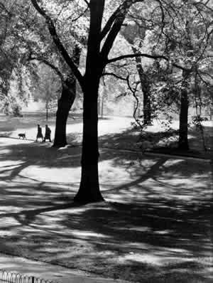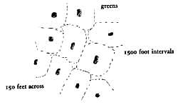 We see that the resulting curve is S-shaped. It starts going down at a certain angle, then gets much steeper, and then flattens out again. Apparently there is a threshold somewhere between 2 and 3 blocks, where people's behavior and motivation change drastically. Those people who live in close proximity to a green follow a high intensity use function - it has a steep gradient and it is very sensitive to increasing distance. But those people who live far from a green appear to adopt a low intensity use function (indicated by a shallower gradient), and their behavior is not as sensitive to distance. It is as if those people with ready access to a green display a full, free responsiveness to it; while people far away have lost their awareness of it and have suffered a reduced sensitivity to the pleasures of the green - for these people, the green has ceased to be a vital element in their neighborhood life. Apparently, within a two to three block radius (a three-minute walking distance) people are able to satisfy their need for access to a green, but a greater distance seriously interferes with their ability to meet this need. This inference is rather unexpected. We know that people who are close to a green go to it fairly often, presumably because they need the relaxation. The people who live more than three minutes walk from the green also need the relaxation, presumably. But in their case the distance prevents them from meeting their need. It seems then, that to meet this need, everyone - and that means every house and every workplace - must be within three minutes of such a park. One question remains. How large must a green be in order to satisfy this need? In functional terms this is easy to answer. It must be large enough so that, at least in the middle of it, you feel that you are in touch with nature, and away from the hustle and bustle. Our current estimates suggest that a green should be as much as 6o,000 square feet in area, and at least 150 feet wide in the narrowest direction in order to meet this requirement. Therefore: Build one open public green within three minutes' walk - about 750 feet - of every house and workplace. This means that the greens need to be uniformly scattered at 1500-f0ot intervals, throughout the city. Make the greens at least 150 feet across, and at least 60,000 square feet in area. Pay special attention to old trees, look after them - Tree Places (171); shape the green so that it forms one or more positive room-like spaces and surround it with trees, or walls, or buildings, but not roads or cars - Positive Outdoor Space (106), Garden Wall (173); and perhaps set aside some part of the green for special community functions - Holy Ground (66), Grave Sites (70), Local Sports (72), Animals (74), Sleeping in Public (94). . . .