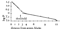In the third column, we write the number of people who have come from that distance, each person multiplied by the number of trips per week he makes to the park. This gives us a measure of the total number of trips per week, which originate in that ring. In the fourth column we write the number of trips per week divided by the area of the ring. If we assume that people are distributed throughout the entire area at approximately even density, this gives us a measure of the probability that any one person, in a given ring, will make a trip to the park in a given week. In the fifth column we write the logarithm (base io) of this probability measure P. Simple inspection of these data shows that while the probability measure, P, drops in half between one and two blocks, it drops by a factor of four between two and three blocks. Its rate of decrease diminishes from then on. This indicates that an individual's use of a park changes character radically if he lives more than three blocks away. For more precision let us examine the relationship between distance and the logarithm of P. Under normal circumstances, the frequency of access to a given center will vary according to some distance decay function, such as P = Ae-Br , where A and B are constants, and r is the radius. This means that if behavior and motivation are constant with respect to distance, and we plot the log of P against the radius, we should get a straight line. Any aberration from the straight line will show us the threshold where one kind of behavior and motivation changes to another. This plot is shown below: Beyond two or three blocks use of the green drops off drastically.