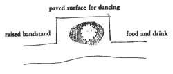 Why is it that people don't dance in the streets today? All over the earth, people once danced in the streets; in theater, song, and natural speech, "dancing in the street" is an image of supreme joy. Many cultures still have some version of this activity. There are the Balinese dancers who fall into a trance whirling around in the street; the mariachi bands in Mexico - every town has several squares where the bands play and the neighborhood comes out to dance; there is the European and American tradition of bandstands and jubilees in the park; there is the bon odori festival in Japan, when everybody claps and dances in the streets. But in those parts of the world that have become "modern" and technically sophisticated, this experience has died. Communities are fragmented; people are uncomfortable in the streets, afraid with one another; not many people play the right kind of music; people are embarrassed. Certainly there is no way in which a change in the environment, as simple as the one which we propose, can remedy these circumstances. But we detect a change in mood. The embarrassment and the alienation are recent developments, blocking a more basic need. And as we get in touch with these needs, things start to happen. People remember how to dance; everyone takes up an instrument; many hundreds form little bands. At this writing, in San Francisco, Berkeley, and Oakland there is a controversy over "street musicians" - bands that have spontaneously begun playing in streets and plazas whenever the weather is good - where should they be allowed to play, do they obstruct traffic, shall people dance? It is in this atmosphere that we propose the pattern. Where there is feeling for the importance of the activity re-emerging, then the right setting can actualize it and give it roots. The essentials are straightforward: a platform for the musicians, perhaps with a cover; hard surface for dancing, all around the bandstand; places to sit and lean for people who want to watch and rest; provision for some drink and refreshment (some Mexican bandstands have a beautiful way of building tiny stalls into the base of the bandstand, so that people are drawn though the dancers and up to the music, for a fruit drink or a beer); the whole thing set somewhere where people congregate. Therefore: Along promenades, in squares and evening centers, make a slightly raised platform to form a bandstand, where street musicians and local bands can play. Cover it, and perhaps build in at ground level tiny stalls for refreshment. Surround the bandstand with paved surface for dancing -- no admission charge. Place the bandstand in a pocket of activity, toward the edge of a square or a promenade - Activity Pockets (124); make it a room, defined by trellises and columns - Public Outdoor Room (69); build Food Stands (93) around the bandstand; and for dancing, maybe colored canvas canopies, which reach out over portions of the street, and make the street, or parts of it, into a great, half-open ten t- Canvas Roofs (244). . . .