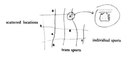 Sports also have a special life of their own, which cannot be duplicated. Throwing the ball around, shouting out, winning a crushing victory, losing a long drawn out match, getting a wild ball back on the net somehow, anyhow - those arc moments that cannot be captured by a job of work. They are entirely different; perhaps they cater especially to what E. Hart calls the psychoemotional component of muscular activity. ("The Need for Physical Activity," in S. Maltz, ed., Health Readings, Wm. Brown Book Company, Iowa, 1968, p. 240.) In any case, it is a kind of vitality that cannot be replaced. Therefore: Scatter places for team and individual sports through every work community and neighborhood: tennis, squash, table tennis, swimming, billiards, basketball, dancing, gymnasium ... and make the action visible to passers-by, as an invitation to participate.