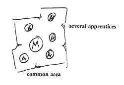 We believe that variations of this pattern are possible in many different work organizations, as well as the schools. The practice of law, architecture, medicine, the building trades, social services, engineering - each discipline has the potential to set up its ways of learning, and therefore the environments in which its practitioners work, along these lines. Therefore: Arrange the work in every workgroup, industry, and office, in such a way that work and learning go forward hand in hand. Treat every piece of work as an opportunity for learning. To this end, organize work around a tradition of masters and apprentices: and support this form of social organization with a division of the workspace into spatial clusters - one for each master and his apprentices where they can work and meet together.
