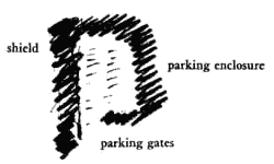 And of course, the houses themselves can serve the same function. In Paris, many of the most charming and beautiful apartment houses are arranged around courtyards, which permit parking inside, away from the street. There are few enough cars, so that they don't destroy the courtyard, for the houses; and the street is left free of parked cars entirely. Along with the need to shield parking structures there is the equally pressing need on the part of a driver to be able to spot the parking structure quickly - and see how it is connected to the building he is headed for. One of the most frequent complaints about the parking near a building is not that it is too far away, but that you don't know where you can go to find a parking spot and still be sure of how to get back into the building. This means that: 1. Parking, which is specifically for the use of visitors, must be clearly marked from the directions of approach, even though the structure as a whole is shielded. The person who is coming by car will be looking for the building, not the parking lot. The entrance to parking must be marked as an important entrance - a gate - so that you can see it automatically, in the process of looking for the building. And it must be placed so that you find it about the same time that you see the building's main entrance. 2. While you are parking your car you must be able to see the exit from the parking area which will lead you into the building. This will let you search for the closest spots, and will mean that you don't have to walk around searching for the exit. Therefore: Put all large parking lots, or parking garages, behind some kind of natural wall, so that the cars and parking structures cannot be seen from outside. The wall which surrounds the cars may be a building, connected houses, or housing hills, earth berms, or shops. Make the entrance to the parking lot a natural gateway to the buildings which it serves, and place it so that you can easily see the main entrance to the building from the entrance to the parking.
