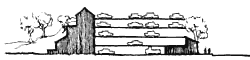 Large parking structures full of cars are inhuman and dead buildings - no one wants to see them or walk by them. At the same time, if you are driving, the entrance to a parking structure is essentially the main entrance to the building - and it needs to be visible. In Nine Percent Parking (22), we have already defined an upper limit on the total amount of parking in a neighborhood. In Small Parking Lots (103) we give the best size and the distribution of the lots when they are on the ground. But in certain cases it is still necessary to build larger parking lots or parking structures. The environment can tolerate these larger lots and structures, provided that they are built so that they do not pollute the land around them. This is a simple biological principle. In the human body, for example, there are waste products; the waste products are part of the way the body works, and obviously they must have a place. But the stomach and colon are built in such a way as to shield the other internal organs from the poisons carried by the wastes. The same is true in a city. At this moment in history the city requires a certain limited amount of parking; and for the time being there is no getting away from that. But the parking must be built in such a way that it is shielded - by shops, houses, hills of grassy earth, walls, or any other buildings of any kind - anything, so long as the interior of the parking structure and the cars are not visible from the surrounding land. On ground level, the shield is especially critical. Shops are useful since they generate their own pedestrian scale immediately. And since the need for parking often goes hand in hand with commercial development, shops are often very feasible economically.