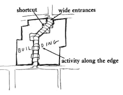 4. Wide entrance As far as possible, the indoor street should be a continuation of the circulation outside the building. To this end, the path into the building should be as continuous as possible, and the entrance quite wide - more a gateway than a door. An entrance that is 15 feet wide begins to have this character. 5. Involvements along the edge To invite the free loitering described above under Shortcut,the street needs a continuum of various "involvements" along its edge. Rooms next to the street should have windows opening onto the street. We know it is unpleasant to walk down a corridor lined with blank walls. Not only do you lose the sense of where you are but you get the feeling that all the life in the building is on the other side of the walls, and you feel cut off from it. We guess that this contact with the public is not objectionable for the workers, so long as it is not too extreme, that is, as long as the workplace is protected either by distance or by a partial wall.