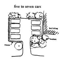 Therefore: Make parking lots small, serving no more than five to seven cars, each lot surrounded by garden walls, hedges, fences, slopes, and trees, so that from outside the cars are almost invisible. Space these small lots so that they are at least 100 feet apart. Place entrances and exits of the parking lots in such a way that they fit naturally into the pattern of pedestrian movement and lead directly, without confusion, to the major entrances to individual buildings - Circulation Realms (98). Shield even these quite modest parking lots with garden walls, and trees, and fences, so that they help to generate the space around them Positive Outdoor Space (106), Tree Places (171), Garden Walls (173). . . .