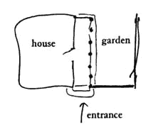 If a garden is too close to the street, people won't use it because it isn't private enough. But if it is too far from the street, then it won't be used either, because it is too isolated. Start by thinking about the front gardens which you know. They are often decorative, lawns, flowers. But how often are people sitting there? Except at those special moments, when people want specifically to be watching the street, the front garden is nothing but a decoration. The half-private family groups, drinks with friends, playing ball with the children, lying in the grass - these need more protection than the typical front garden can create. And the back gardens do not really solve the problem either. Those back gardens which are entirely isolated, entirely "in back" - are so remote from the street, that people often don't feel comfortable there either. Often the back garden is so remote from the street, that you can't hear people coming to the house; you have no sense of any larger, more open space, no sense of other people - only the enclosed, isolated, fenced-in world of one family. Children, so much more spontaneous and intuitive, give us a view in microcosm. How rarely they play in the full back garden; how much more often they prefer these side yards and gardens which have some privacy, yet also some exposure to the street. It seems then, that the proper place for a garden is neither in front, nor fully behind. The garden: needs a certain degree of privacy, yet also wants some kind of tenuous connection to the street and entrance. This balance can only be created in a situation where the garden is half in front, half in back - in a word, at the side, protected by a wall from too great an exposure to the street; and yet open enough, through paths, gates, arcades, trellises, so that people in the garden still have a glimpse of the street, a view of the front door or the path to the front door. All this requires a revolution in the normal conception of a "lot." Lots are usually narrow along the street and deep. But to create half-hidden gardens, the lots must be long along the street, and shallow, so that each house can have a garden at its side. This gives the following archetype for house and half-hidden garden.