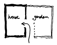 Another example. The garden that we used was to the back, but behind the next door house. It worked perfectly as a half-hidden garden for our house. We were able to sit there privately and have our lunch, and work on warm days, and still be in touch with the main entrance and even a glimpse of the street. But our own back garden was entirely hidden - and we never used it. Therefore: Do not place the garden fully in front of the house, nor fully to the back. Instead, place it in some kind of half-way position, side-by-side with the house, in a position which is half-hidden from the street, and half-exposed.