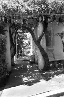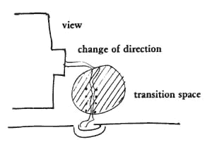 As you see from these examples, it is possible to make the transition itself in many different physical ways. In some cases, for example, it may be just inside the front door - a kind of entry court, leading to another door or opening that is more definitely inside. In another case, the transition may be formed by a bend in the path that takes you through a gate and brushes past the fuchsia on the way to the door. Or again, you might create a transition by changing the texture of the path, so that you step off the sidewalk onto a gravel path and then up a step or two and under a trellis. In all these cases, what matters most is that the transition exists, as an actual physical place, between the outside and the inside, and that the view, and sounds, and light, and surface which you walk on change as you pass through this place. It is the physical changes - and above all the change of view - which creates the psychological transition in your mind. Therefore: Make a transition space between the street and the front door. Bring the path which connects street and entrance through this transition space, and mark it with a change of light, a change of sound, a change of direction, a change of surface, a change of level, perhaps by gateways which make a change of enclosure, and above all with a change of view. Emphasize the momentary view which marks the transition by a glimpse of a distant place - Zen View (134) ; perhaps make a gateway or a simple garden gate to mark the entrance - Garden Wall (173) ; and emphasize the change of light - Tapestry of Light and Dark (135), Trellised Walk (174). The transition runs right up to the front door, up to the Entrance Room (130), and marks the beginning of the Intimacy Gradient (127) . . . .