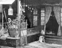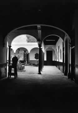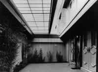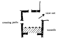 There seem to be three distinct ways in which these courtyards fail. 1. There is too little ambiguity between indoors and outdoors. If the walls, sliding doors, doors which lead from the indoors to the outdoors, are too abrupt, then there is no opportunity for a person to find himself half way between the two - and then, on the impulse of a second, to drift toward the outside. People need an ambiguous in-between realm - a porch, or a veranda, which they naturally pass onto often, as part of their ordinary life within the house, so that they can drift naturally to the outside. 2. There are not enough doors into the courtyard. If there is just one door, then the courtyard never lies between two activities inside the house; and so people are never passing through it, and enlivening it, while they go about their daily business. To overcome this, the courtyard should have doors on at least two opposite sides, so that it becomes a meeting point for different activities, provides access to them, provides overflow from them, and provides the cross-circulation between them. 3. They are too enclosed. Courtyards which are pleasant to be in always seem to have "loopholes" which allow you to see beyond them into some larger, further space. The courtyard should never be perfectly enclosed by the rooms which surround it, but should give at least a glimpse of some other space beyond. Here are several examples of courtyards, large and small, from various parts of the world, which are alive. Courtyards which live. Each one is partly open to the activity of the building that surrounds it and yet still private. A person passing through the courtyard and children running by can all be glimpsed and felt, but they are not disruptive. Again, notice that all these courtyards have strong connections to other spaces. The photographs do not tell the whole story but still, you can see that the courtyards look out, along paths, through the buildings, to larger spaces. And most spectacular, notice the many different positions that one can take up in each courtyard, depending on mood and climate. There are covered places, places in the sun, places spotted with filtered light, places to lie on the ground, places where a person can sleep. The edge and the corners of the courtyards are ambiguous and richly textured; in some places the walls of the buildings open, and connect the courtyard with the inside of the building, directly. Therefore: Place every courtyard in such a way that there is a view out of it to some larger open space; place it so that at least two or three doors open from the building into it and so that the natural paths which connect these doors pass across the courtyard. And, at one edge, beside a door, make a roofed veranda or a porch, which is continuous with both the inside and the courtyard.