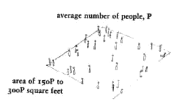 Although these subjective estimates are clearly open to question, they suggest the following rule of thumb: At 150 square feet per person, an area is lively. If there are more than 500 square feet per person, the area begins to be dead. Even if these figures are only correct to within an order of magnitude, we can use them to shape public pedestrian areas - squares, indoor streets, shopping streets, promenades. To use the pattern it is essential to make a rough estimate of the number of people that are typically found in a given space at any moment of its use. In the front area of a market, for example, we might find that typically there are three people lingering and walking. Then we shall want the front of this market to form a little square, no larger than 450 square feet. If we estimate a pedestrian street will typically contain 35 people window shopping and walking, we shall want the street to form an enclosure of roughly 5000 square feet. (For an example of this calculation in a more complicated case - the case of a square in a public building that has yet to be built - see A Pattern Language Which Generates Multi-Service Centers, Alexander, Ishikawa, Silverstein, Center for Environmental Structure, 1968, p. 148.) Therefore: For public squares, courts, pedestrian streets, any place where crowds are drawn together, estimate the mean number of people in the place at any given moment (P), and make the area of the place between 150P and 300P square feet. Embellish the density and feeling of life with areas at the edge which are especially crowded - Street Cafe (88), Activity Pockets (124), Stair Seats (125), Private Terrace on the Street (140), Building Edge (160), Street Windows (164), Opening to the Street (165), Gallery Surround (166).