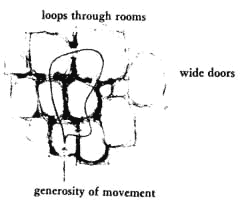 Even better, is the case where there is a loop. A loop, which passes through all the major rooms, public and common, establishes an enormous feeling of generosity. With a loop it is always possible to come and go in two different directions. It is possible to walk around and around, and it ties the rooms together. And, when such a loop passes through rooms (at one end so as not to disturb them), it connects rooms far more than a simple passage does.