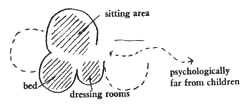 The presence of children in a family often destroys the closeness and the special privacy which a man and wife need together. Every couple start out sharing each other's adult lives. When children come, concern for parenthood often overwhelms the private sharing, and everything becomes exclusively oriented toward the children. In most houses this is aggravated by the physical design of the environment. Specifically: 1. Children are able to run everywhere in the house, and therefore tend to dominate all of it. No rooms are private. 2. The bathroom is often placed so that adults must walk past children's bedrooms to reach it. 3. The walls of the master bedroom are usually too thin to afford much acoustical privacy. The result is that the private life of the couple is continually interrupted by the awareness that the children are nearby. Their role as parents rather than as a couple permeates all aspects of their private relations. On the other hand, of course, they do not want to be completely separated from the children's rooms. They also, want to be close to them, especially while the children are young. A mother wants to run quickly to the bed of an infant in an emergency. These problems can only be solved if there is a part of the house, which we call the couple's realm; that is, a world in which the intimacy of the man and woman, their joys and sorrows, can be shared and lived through. It is a place not only insulated from the children's world, but also complete in itself, a world, a domain. In many respects it is a version of the pattern House for a Couple (77), embedded in the larger house with children. The couple's realm needs to be the kind of place that one might sit in and talk privately, perhaps with its own entrance to the outdoors, to a balcony. It is a sitting room, a place for privacy, a place for projects; the bed is part of it, but tucked away into an alcove with its own window; a fireplace is wonderful; and it needs some kind of a double door, an ante-room, to protect its privacy. Therefore: Make a special part of the house distinct from the common areas and all the children's rooms, where the man and woman of the house can be together in private. Give this place a quick path to the children's rooms, but, at all costs, make it a distinctly separate realm.