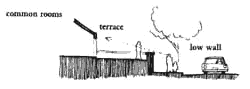 Private terrace on the street. Therefore: Let the common rooms open onto a wide terrace or a porch which looks into the street. Raise the terrace slightly above street level and protect it with a low wall, which you can see over if you sit near it, but which prevents people on the street from looking into the common rooms.