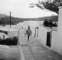 As the pedestrian looks toward the house from the sidewalk, the masonry terrace wall is located so that his line of sight over its top falls at the lower edge of the elaborately leaded upper glass zone of the terrace doors. Vision into the living room from the sidewalk thus is carefully controlled. If the occupant within the house is standing near the doors only his head and shoulders are dimly visible through a diffusing surface. If the occupant is sitting he is, of course, completely hidden from the,pedestrian's view. But whereas the pedestrian cannot effectively intrude on the privacy of the house, the inhabitant on the other hand has a number of options available at will. As he stands or sits on the terrace itself, well above the sidewalk, the effect is of easy participation in the full panorama of the street. From the elevated platform vision is unobstructed. Neighbors and friends can be waved at, greeted, invited in for a chat. Thus the terrace, projecting toward the street, linked - and still links - the Cheney house and its inhabitants to the community life of Oak Park. The configuration is so successful that, as in the Robie house, there has never been much need for curtains. The parapets and the leaded glass, carefully placed, do it all. Thus out of the decision to face the living room toward the street has come not a sacrifice of privacy, but a much richer range of alternative experiences for the occupant. We believe that Wright's use of this pattern was based on accurate intuitions about a fundamental human need. Indeed, there are empirical grounds for believing that the need for a house to be in touch with the street outside is a fundamental psychological necessity: and that its opposite - the tendency some people have to keep their houses away from the street, locked up, barred, and disconnected from the street - is a symptom of a serious emotional disorder - the autonomy-withdrawal syndrome. See Alexander, "The City as a Mechanism for Sustaining Human Contact," W. Ewald, ed., Environment for Man,Indiana University Press, 1967, pp. 60-102. Here is an example of this pattern from Greece. It is clear that the pattern can be expressed in many ways, so long as the relationship, the balance of privacy and street contact, is maintained.