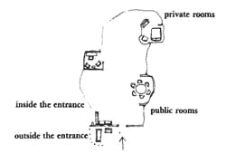 Every corner of a building is a potential sitting space. But each sitting space has different needs for comfort and enclosure according to its position in the intimacy gradient. We know from Intimacy Gradient (127) that a building has a natural sequence of spaces in it, ranging from the most public areas, outside the entrance, to the most private, in individual rooms and couples realms. Here is a sequence of sitting spaces that would correspond roughly to the Intimacy Gradient (127): 1. Outside the entrance - Entrance Room (130), Front Door Bench (242) 2. Inside the entrance - Entrance Room (130), Reception Welcomes You (149) 3. Common rooms - Common Areas at the Heart (129), Short Passages (132), Farmhouse Kitchen (139), Small Meeting Rooms (151) 4. Half-private rooms - Children's Realm (137), Private Terrace on the Street (140), Half-Private Office (152), Alcoves (179) 5. Private rooms - Couple's Realm (136), A Room of One's Own (141), Garden Seat (176). Now, what is the problem? Simply, it is the following. People have a tendency to think about the sitting room, as though a building, and especially a house, has just one room made for sitting. Within this frame of reference, this one sitting room gets a great deal of care and attention. But the fact that human activity naturally occurs all through the house, at a variety of degrees of intensity and intimacy, is forgotten - and the sitting spaces throughout the building fail to support the real rhythms of sitting and hanging around. To solve the problem, recognize that your building should contain a sequence of sitting spaces of varying degrees of intimacy, and that each space in this sequence needs the degree of enclosure and comfort appropriate to its position. Pay attention to the full sequence, not just to one room. Ask yourself if the building you are making or repairing has the full sequence of sitting spaces, and what needs to be done to create this sequence, in its full richness and variety. Of course, you may want to build a special sitting room - a sala or a parlor or a library or a living room - as one of the sitting spaces in your house. But remember that each office and workroom needs a sitting space too; so does a kitchen, so does a couple's realm, so does a garden, so does an entrance room, so does a corridor even, so does a roof, so does a window place. Pick the sequence of sitting spaces quite deliberately, mark it, and pay equal attention to the various spaces in the sequence as you go further into the details of the design. Therefore: Put in a sequence of graded sitting spaces throughout the building, varying according to their degree of enclosure. Enclose the most formal ones entirely, in rooms by themselves; put the least formal ones in corners of other rooms, without any kind of screen around them; and place the intermediate one with a partial enclosure round them to keep them connected to some larger space, but also partly separate.