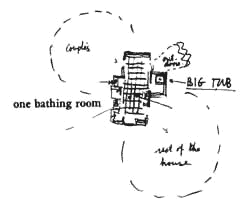 . . . this pattern defines and places the main bathroom of a building. It does it by changing the present character of bathing rooms completely: And its position is so clear, and so essential, that it will probably help to form the sleeping areas and public areas given by larger patterns: Intimacy Gradient (127), Common Areas at the Heart (129), Couple's Realm (136), Children's Realm (137), Sleeping to the East (138), Bed Cluster (143).