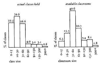 There is no particularly natural threshold for group size; but it is clear that the number who never talk climbs very rapidly. In a group of 12, one person never talks. In a group of 24, there are six people who never talk. We get similar thresholds when we consider comfortable distances for talking. Edward Hall has established the upper range for full casual voice at about 8 feet; a person with 20/20 vision can see details of facial expression up to 12 feet; two people whose heads are 8 to 9 feet apart, can pass an object if they both stretch; clear vision (that is, macular vision) includes 12 degrees horizontally and 3 degrees vertically - which includes one face but not two, at distances up to about 10 feet. (See Edward Hall, The Silent Language,New York: Doubleday, 1966, pp. 118-19.) Thus a small group discussion will function best if the members of the group are arranged in a rough circle, with a maximum diameter of about 8 feet. At this diameter, the circumference of the circle will be 25 feet. Since people require about 27 inches each for their seats, there can be no more than about 12 people round the circle. Next we shall present evidence to show that in institutions and workgroups, the natural history of meetings tends also to converge on this size. The following histograms show the relative numbers of different sized classes held at the University of Oregon in the Fall of 1970 and the relative numbers of available classrooms in the different size ranges. We believe these figures are typical for many universities. But it is obvious at a glance that there are too many large classrooms and too few small classrooms. Most of the classes actually held are relatively small seminars and "section" meetings, while most of the classrooms are in the 30 to 150 size range. These large classrooms may have reflected the teaching methods of an earlier period, but apparently they do not conform to the actual practice of teaching in the 1970's.