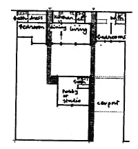 Dybbroe's four-part house. Though renting in general has a devastating impact on the environment - see Your Own Home (79) our experience has been that face-to-face rental, with the owners occupying the main structure, is the one kind of rental relationship that is reasonably healthy. The landlord is actually there, so he is directly concerned with the well-being of the life around him and with the environment, unlike the absentee landlords, who own property only for the money which it makes. And the tenants are usually short-term tenants, who prefer to rent a room rather than take on burdens of ownership. Even here a more ideal situation would be for the owner to share out ownership over some part of the building, with certain options for taking back the space. However, in the absence of such subtle forms of legal ownership, face to face renting is, we believe, the only form of renting that is not socially and physically destructive. Therefore: Make at least some part of the building rentable: give it a private entrance over and above its regular connection to the rest of the house. Make sure that the regular entrance can be easily closed off without destroying the circulation in the house, and make sure that a bathroom can be directly reached from this room without having to go through the main house.