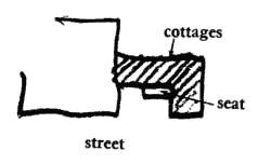 Old people, especially when they are alone, face a terrible dilemma. On the one hand, there are inescapable forces pushing them toward independence: their children move away; the neighborhood changes; their friends and wives and husbands die. On the other hand, by the very nature of aging, old people become dependent on simple conveniences, simple connections to the society about them. This conflict is reflected often in their children's conflict. On the one hand, children feel responsible for their parents, because, of course, they sense their growing need for care and comfort. On the other hand, as families are whittled down, parent-child conflicts become more acute, and few people can imagine actually being able or willing to take care of their parents in their dotage. The conflict can be partly resolved, if each house which houses a nuclear family has, somewhere near it, a small cottage where a grandparent can live, far enough away to be independent, and yet close enough to feel some tie and to be cared for in a time of trouble or approaching death. But the conflict is more general. Even if we ignore, altogether, the complexities of parent-child relationships, the fact is that most old people face enormous difficulties as they grow older. The welfare state tries to replace the comfort of the extended family with payments - social security or pensions. This income is always tiny; and inflation makes it worse. In the United States, one-quarter of the population over 65 lives on less than $4000 a year. Many of the old people in our society are forced to live in miserable tiny rooms, way in the back of some run-down old folks hotel. They cannot have a decent house, because there are no decent tiny houses compatible with a small income and reduced activity. This second conflict, between the need for someplace really small and modest and the need for social contact, a view of passing people, someone to nod to, a place in the sun, can also be resolved, like the first conflict, by cottages. It can be resolved, if there are many tiny cottages, dotted among the houses of communities and always strung along pedestrian paths - tiny enough to be really cheap. Therefore: Build small cottages specifically for old people. Build some of them on the land of larger houses, for a grand parent; build others on individual lots, much smaller than ordinary lots. In all cases, place these cottages at ground level, right on the street, where people are walking by, and close to neighborhood services and common land.