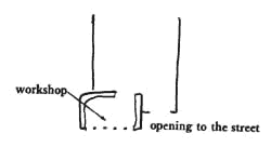 As the decentralization of work becomes more and more effective, the workshop in the home grows and grows in importance. We have explained in Scattered Work (9), Network of Learning (18), Men and Women (27), Self-Governing Workshops and Offices (80), and other patterns that we imagine a society in which work and family are far more intermingled than today; a society in which people - businessmen artists, craftsmen, shopkeepers, professionals - work for themselves, alone and in small groups, with much more relation to their immediate surroundings than they have today. In such a society, the home workshop becomes far more than a basement or a garage hobby shop. It becomes an integral part of every house; as central to the house's function as the kitchen or the bedrooms. And we believe its most important characteristic is its relationship to the public street. For most of us, work life is relatively public. Certainly, compared to the privacy of the hearth, it is a public affair. Even where the public relationship is slight, there is something to be gained, both for the worker and the community, by enlarging the connection between the two. In the case of the home workshop, the public nature of the work is especially valuable. It brings the workshop out of the realm of backyard hobbies and into the public domain. The people working there have a view of the street; they are exposed to the people passing by. And the people passing learn something about the nature of the community. The children especially are enlivened by this contact. And according to the nature of the work, the public connection takes the form of a shopfront, a driveway for loading and unloading materials, a work bench in the open, a small meeting room . . . We therefore advocate provision for a substantial workshop with all the character of a real workplace and some degree of connection to the public street: at least a glancing connection so that people can see in and out; and perhaps a full connection, like an open shop front. Therefore: Make a place in the home, where substantial work can be done; not just a hobby, but a job. Change the zoning laws to encourage modest, quiet work operations to locate in neighborhoods. Give the workshop perhaps a few hundred square feet; and locate it so it can be seen from the street and the owner can hang out a shingle.