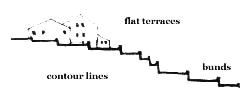 On sloping land, erosion caused by run off can kill the soil. It also creates uneven distribution of rainwater over the land, which naturally does less for plant life than it could if it were evenly distributed. Terraces and bunds, built along contour lines, have been used for thousands of years to solve this problem. Erosion starts when the water runs down certain lines, erodes the earth along these lines, makes it hard for plants to grow there, then forms rills in the mud and dust, which are then still more vulnerable to more runoff, and get progressively worse and worse. The terraces control erosion by slowing down the water, and preventing the formation of these rills in the first place. Even more important, the terraces spread the water evenly over the entire landscape. In a given area, each square meter of earth gets the same amount of water since the water stays where it falls. Under these conditions, plants can grow everywhere on the steepest parts of hillsides as easily as in the most luscious valleys. The pattern of terracing makes as much sense on a small house lot as it does on the hills around a valley. Proper terracing on a small lot creates a stable micro-system of drainage, and protects the top soil for the local gardens. Our main photograph shows a small building that is built on a terraced site. Once the terracing has been accomplished, the building can fit to it, and stretch across the lines of the terrace. At both scales - the house lot and the hills - this method of conserving the land and making it healthy is ancient. "Only very lately has modern anti-erosion practice, for example, through contour ploughing, managed to match the effectiveness of traditional methods of terracing long practiced in countries as far apart as Japan and Peru." (M. Nicholson, The Environmental Revolution, New York: McGraw Hill, 1970, p. 192.) At the scale of hillsides and valleys, China is making an impressive attempt to reclaim her eroded land in this way. For instance, Joseph Alsop, "Terraced Fields in China": In the Chinese countryside, no effort has ever been spared to get a maximum crop with the resources available. Even so, I was hardly prepared for the "terrace fields" that they took me to see in the farming communes around Chungking. The countryside hereabouts is both rocky and largely composed of such steep hills that even Chinese would not think of trying to grow rice on them. The old way, ruinously eroding, was to grow as much rice as possible in the valleys: and then plant the hillsides, too, where soil remained. The new way is to make "terrace fields." The rocks are dynamited to get the needed building materials. Heavy dry-stone walls are then built to heights of six or seven feet, following the contours of the land. And earth is finally brought to fill in behind the stone walls, thereby producing a terrace field. Therefore: On all land which slopes - in fields, in parks, in public gardens, even in the private gardens around a house - make a system of terraces and bunds which follow the contour lines. Make them by building low walls along the contour lines, and then backfilling them with earth to form the terraces. There is no reason why the building itself should fit into the terraces - it can comfortably cross terrace lines.
