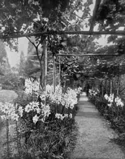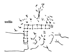 . . . suppose the main spots of the garden have been defined - Outdoor Room (163), Tree Places (171), Greenhouse (175), Fruit Trees (170). Now, where there is a special need to emphasize a path - Paths and Goals (120) - or, even more important, where the edges between two parts of a garden need to be marked without making a wall, an open trellised walk which can enclose space, is required. Above all, these trellised walks help to form the Positive Outdoor Spaces (106) in a garden or a park; and may perhaps help to form an Entrance Transition (112).