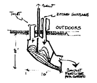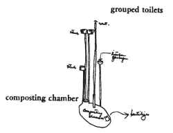 Our current ways of getting rid of sewage poison the great bodies of natural water, and rob the land around our buildings of the nutrients they need. To the average individual in the city, it probably appears that the sewage system works beautifully - no muss, no fuss. just pull the toilet chain, and everything is fine. In fact, city dwellers who have had the experience of using a smelly outhouse would probably argue that our modern system of sewage disposal is a tremendous advance over earlier practices. Unfortunately, this is simply not the case. Almost every step in modern sewage disposal is either wasteful, expensive, or dangerous. We can start by remembering that every single time a toilet is flushed, seven gallons of drinking water go down the drain. In fact, around half of our domestic water consumption goes to flushing out the toilet. Beyond the cost of the water, there is an enormous cost in the hardware of the sewer system. The average new homeowner today, living on a 50 x 150 foot lot in the city, has paid $1500 as his share of the collection system which takes sewage from his house to the sewage treatment plant. In lower density residential areas, this cost may be $2000 or even $6000. Each house pays an additional $500 toward the cost of the sewage treatment plant. We see then that the initial cost of today's sewage system is at least $2000 per house, often more. And these prices do not include monthly service charges for water and sewer facilities: around $50 per year for a single family household. In addition we must add those costs which are less easily measurable in dollars and cents, but which may, in the long run, prove even higher than those already discussed. These include: (1) the value of lost nutrients which are allowed to flow away into the rivers and oceans - nutrients which could have been used to build up the soil they came from; and (2) the cost of the pollution: effluents cause "eutrophication" - the sewage depletes the oxygen in water and causes it to become clogged with algae. What can be done? Some of this effluent might be recycled back to the land in the form of sludge. But residential sewage is usually mixed with industrial waste which often contains extremely noxious elements. And even if industrial wastes were not allowed into the sewage system, an additional distribution system would be needed to get the sludge back to the land. We see, therefore, that additional costs required to make the existing system ecologically sound are prohibitive. What is needed is not a larger, more centralized and complex system, but a smaller, more decentralized and simpler one. We need a system that is less expensive; and we need a system that is an ecological benefit rather than an ecological drain. We propose that individual small-scale composting plants begin to replace