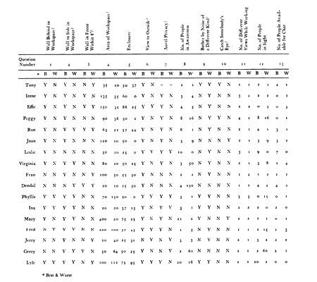People cannot work effectively if their workspace is too enclosed or too exposed. A good workspace strikes the balance. In many offices, people are either completely enclosed and feel too isolated, or they are in a completely open area as in the office landscape and feel too exposed. It is hard for a person to work well at either of these two extremes - the problem is to find the right balance between the two. To find the proper balance, we conducted a simple experiment. We first defined 13 variables, which we thought might influence a person's sense of enclosure in his workspace. These 13 variables are: 1. Presence or absence of a wall immediately behind you. 2. Presence or absence of a wall immediately beside you. 3. Amount of open space in front of you. 4. Area of the workspace. 5. Total amount of enclosure around the immediate workspace. 6. View to the outside. 7. Distance to nearest person. 8. Number of people you are aware of from your workplace. 9. Noise: level and type. 10. Presence or absence of a person facing you directly. 11. Number of different positions you can sit in. 12. Number of people you can see from your workspace. 13. The number of people you can talk to without raising your voice. We then formulated thirteen hypotheses which connect these variables with the comfort of the work space. The hypotheses are listed below. We interviewed 17 men and women who had all worked in several different offices. In the interview, we first asked each person to think of the very best workspace he (or she) had ever worked in and the very worst; and then asked him (or her) to make a sketch plan of both spaces. Then we asked questions to identify the value of each of these 13 variables in the "best" and "worst" workspaces. Thus, for instance, we might point to one of the sketches a person had drawn, and say "How far away was that wall" to establish the value of the third variable. The values of the variables for the 17 best and worst workspaces are given in the following table. On the basis of this table, we then calculated the probable significance of our hypotheses, according to the chi-squared test. Nine of the hypotheses appear to be significant according to the chi-squared test, and four are not. We now list the nine "significant" hypotheses, and with each one, in parentheses, we venture an explanation for its success. 1. You feel more comfortable in a workspace if there is a wall behind you. (If your back is exposed you feel vulnerable - you can never tell if someone is looking at you, or if someone is coming toward you from behind.) The data support this hypothesis at the 1 per cent level of significance. 2. You feel more comfortable in a workspace it there is a wall to one