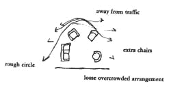 . . . according to the Sequence of Sitting Spaces (142), there will be a variety of different kinds of sitting space throughout an office building or a house or workshop - some formal, some informal, some large, some small, laid out in part according to the Intimacy Gradient (127). This pattern deals with the actual physical layout of any one of these sitting spaces. And of course, it can be used to help create the sequence of sitting spaces, piecemeal, one space at a time.