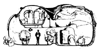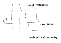 But these biological rooms are as irrational, as much based on images and fantasies as the rigid crystals they arc trying to replace. When we think about the human forces acting on rooms, we see that they need a shape which lies between the two. There are reasons why their sides should be more or less straight; and there are reasons why their angles, or many of them anyway, should be rough right angles. Yet their sides have no good reason to be perfectly equal, their angles have no good reason to be perfectly right angles. They only need to be irregular, rough, imperfect rectangles. The core of our argument is this. We postulate that every space, which is recognizable and walled enough to be distinct, must have walls which are roughly straight, except when the walls are thick enough to be concave in both directions. The reason is simple. Every wall has social spaces on both sides of it. Since a social space is convex - see the extensive argument in Positive Outdoor Space (106) - it must either have a wall which is concave (thus forming a convex space) or a wall which is perfectly straight. But any "thin" wall which is concave toward one side, will be convex toward the other and will, therefore, leave a concave space on at least one side.