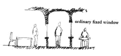 Windows are most often used to create connections between the indoor and the outdoors. But there are many cases when an indoor space needs a connecting window to another indoor space. This is most often true for corridors and passages. These places can easily seem deserted. People feel more connected to one another by interior windows, and the passages in the building become less deserted. The same may hold for certain rooms, especially small rooms. Three bare walls and a window can seem like a prison. Windows placed between rooms, or between a passage and a room, will help to solve these problems and will make both the passages and the rooms more lively. Furthermore, when rooms and passages are visibly connected to one another, it is possible to grasp the overall arrangement of a building far more clearly than in a building with blank walls between all the rooms. It is enough if these windows allow people to see through them; they do not need to be open nor the kind which can be opened. Ordinary, cheap, fixed glazing will do all that is required Therefore: Put in fully glazed fixed windows between rooms which tend to be dead because they have too little action in them or where inside rooms are unusually dark.