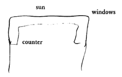 Give the windows a view toward a garden or the area where children play - Windows Overlooking Life (192). If storage space is tight, you can build open shelves for bowls and plates and plants right across the windows and still let in the sun - Open Shelves (200). Build the counter as a special part of the room, integral with the building structure, able to take many modifications later - Thickening The Outer Walls (211). Use Warm Colors (250) around the window to soften and warm the sunlight.