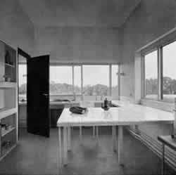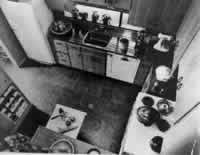 Compare it with this gloomy kitchen. There is no natural light on the work counter, the cabinets are a clutter; it is a shabby experience to work there - to work below a cabinet, facing a wall with artificial light in the middle of the day. This gloomy kitchen is typical of many thousands of kitchens in modern houses. It happens for two reasons. First, people often place kitchens to the north, because they reserve the south for living rooms and then put the kitchen in the left over areas. And it happens, secondly, when the kitchen is thought of as an "efficient" place, only meant for the mechanical cooking operations. In many apartments, efficiency kitchens are even in positions where they get no natural light at all. But, of course, the arguments we have presented in Farmhouse Kitchen (139) for making the kitchen a living room, not merely a machine-shop, change all this. Therefore: Place the main part of the kitchen counter on the south and southeast side of the kitchen, with big windows around it, so that sun can flood in and fill the kitchen with yellow light both morning and afternoon.
