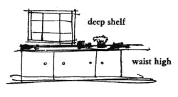 In every house and every workplace there is a daily "traffic" of the objects which are handled most. Unless such things are immediately at hand, the flow of life is awkward, full of mistakes; things are forgotten, misplaced. The essence of this problem lies in the phrase "at hand." This is literally true and needs to be interpreted as such. When a person reaches for something, his hands are roughly at waist height. When there are surfaces here and there, around the rooms and passages and doors, which are at waist height, they become natural places to leave things and later pick them up. Pocket change, pictures, open books, an apple, a package, a newspaper, the day's mail, a reminder note: these things are at hand on a waist high shelf. When there are no such surfaces, then things either get put away and are then forgotten and lost, or they are in the way and must continually be cleared aside. Furthermore, the things that tend to collect on waist high shelves become a natural, evolving kind of display of the most ordinary things - the things that are most immediately a part of one's life. And since for each person these things will vary, the waist high shelf helps a room become unique and personal, effortlessly. Therefore: Build waist-high shelves around at least a part of the main rooms where people live and work. Make them long, 9 to 15 inches deep, with shelves or cupboard underneath. Interrupt the shelf for seats, windows, and doors.