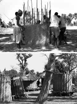 The fundamental philosophy behind the use of pattern languages is that buildings should be uniquely adapted to individual needs and sites; and that the plans of buildings should be rather loose and fluid, in order to accommodate these subtleties. This requires an entirely new attitude toward the process of construction. We may define this attitude by saying that it is desirable to build a building in such a way that it starts out loose and flimsy while final adaptations in plan are made, and then gets stiffened gradually during the process of construction, so that each additional act of construction makes the structure sounder. To understand this philosophy properly, it is helpful to imagine a building being made like a basket. A few strands are put in place. They are very flimsy. Other strands are woven in. Gradually the basket gets stiffer and stiffer. Its final structural strength is only reached from the cooperation of all the members and is not reached until the building is completely finished. In this sense, such a process produces a building in which all parts of it are working structurally - see Efficient Structure (206). Why does the principle of gradual stiffening seem so sensible as a process of building? To begin with, such a structure allows the actual building process to be a creative act. It allows the building to be built up gradually. Members can be moved around before they are firmly in place. All those detailed design decisions which can never be worked out in advance on paper, can be made during the building process. And it allows you to see the space in three dimensions as a whole, each step of the way, as more material is added. This means that since each new material that is added in the process must adapt perfectly to the framework that is there, each new material must be more adaptable, more flexible, more capable of coping with variation, than the last. Thus, though the building as a whole goes from flimsy to strong, the actual materials that are added go from the strongest and stiffest, to the gradually less stiff, until finally fluid materials are added. The essence of this process is very fundamental indeed. We may understand it best by comparing the work of a fifty-year-old carpenter with the work of a novice. The experienced carpenter keeps going. He doesn't have to keep stopping, because every action he performs, is calculated in such a way that some later action can put it right to the extent that it is imperfect now. What is critical here, is the sequence of events. The carpenter never takes a step which he cannot correct later; so he can keep working, confidently, steadily. The novice by comparison, spends a great deal of his time trying to figure out what to do. He does this essentially because he knows that an action he takes now may cause unretractable problems a little further down the line; and if he is not careful, he will find himself with a joint that requires the shortening of some crucial member - at a stage when it is too late to shorten that member. The fear of these kinds of mistakes forces him to spend hours trying to figure ahead: and it forces him to work as far as possible to exact drawings because they will guarantee that he avoids these kinds of mistakes. The difference between the novice and the master is simply that the novice has not learnt, yet, how to do things in such a way that he can afford to make small mistakes. The master knows that the sequence of his actions will always allow him to cover his mistakes a little further down the line. It is this simple but essential knowledge which gives the work of a master carpenter its wonderful, smooth, relaxed, and almost unconcerned simplicity. In a building we have exactly the same problem, only greatly magnified. Essentially, most modern construction has the character of the novice's work, not of the master's. The builders do not know how to be relaxed, how to deal with earlier mistakes by later detailing; they do not know the proper sequence of events; and they do not, usually, have a building system, or a construction process, which allows them to develop this kind of relaxed and casual wisdom. Instead, like the novice, they work exactly to finely detailed drawings; the building is extremely uptight as it gets made; any departure from the exact drawings is liable to cause severe problems, may perhaps make it necessary to pull out whole sections of the work. This novice-like and panic-stricken attention to detail has two very serious results. First, like the novice, the architects spend a great deal of time trying to work things out ahead of time, not smoothly building. Obviously, this costs money; and. helps create these machine-like "perfect" buildings. Second, a vastly more serious consequence: the details control the whole. The beauty and subtlety of the plan in which patterns have held free sway over the design suddenly becomes tightened and destroyed because, in fear that details won't work out, the details of connections, and components, are allowed to control the plan. As a result, rooms get to be slightly the wrong shape, windows go out of position, spaces between doors and walls get altered just enough to make them useless. In a word, the whole character of modern architecture, namely the control of larger space by piddling details of construction, takes over. What is needed is the opposite - a process in which details are fitted to the whole. This is the secret of the master carpenter; it is described in detail in The Timeless Way of Building as the foundation of all organic form and all successful building. The process of gradual stiffening, which we describe here, is the physical and. procedural embodiment of this essential principle. We now ask how, in practice, it is possible to create a gradually stiffened structure within the context defined by the pattern Good Materials (207). Facts about materials give us the starting point we need. I. Sheet materials are easy to