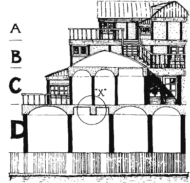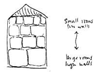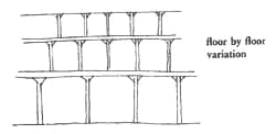 And there is a second, purely structural explanation of the fact that ceilings need to be lower on upper stories. It is embodied in the drawing of the granary shown below. Suppose that a system of columns is calculated for pure structure. The columns on upper stories will be thinner, because they carry less load than those on lower stories. But because they are thinner, they have less capacity to resist buckling, and must therefore be shorter if we are to avoid wasting material. As a result, even in a granary, where there are no social reasons for variation in ceiling height, purely structural considerations create the necessity for thick columns and high ceilings on the lower stories and for thinner and thinner columns and lower and lower ceilings the higher one gets in the building.