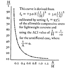 These intuitions are borne out by many traditional building forms where columns, or frames, or stiffeners are larger and further apart near the ground, and finer and closer together higher up. Our key picture shows examples. But what is the structural basis for these intuitions? Elastic plate theory gives us a formal explanation. Consider an unstiffened thin wall carrying an axial load. This wall will usually fail in buckling before it fails in pure compression because it is thin. And this means that the material in the wall is not being used efficiently. It is not able to carry the compressive loads which its compressive strength makes possible because it is too thin. It is therefore natural to design a wall which is either thick enough or stiffened enough so that it can carry loads up to its full compressive capacity without buckling. Such a wall, which uses its material to the limits of its compressive capacity, will then also satisfy the demands of Efficient Structure (206). The critical factor is the slenderness of the wall: the ratio of its height to its thickness. For the simple case of an unstiffened concrete wall, the ACI code tells us that the wall will be able to work at 93 per cent efficiency (that is, carry 93 per cent of its potential compressive load without buckling), if it has a slenderness ratio of 10 or less. A wall 10 feet high and 1 foot thick is therefore efficient in this sense. Suppose now, that we extrapolate to the case of a stiffened wall using elastic plate theory. By using the equation which relates allowable stress to the spacing of stiffeners, we can obtain similar figures for various walls with stiffeners. These figures are presented in the curve below. For example, a wall with a slenderness of 20 needs stiffeners at 0.5H apart (where H is the height) thus creating panels half as wide as they are high. In general, obviously, the thinner the wall is, in relation to its height, the more often it needs to be stiffened along its length. In every case, the curve gives the spacing of stiffeners which is needed to make the wall work at 93 per cent of its compressive strength. In short, we may say that a wall built according to the principle of Efficient Structure (206) ought to be stiffened in accordance with this curve.