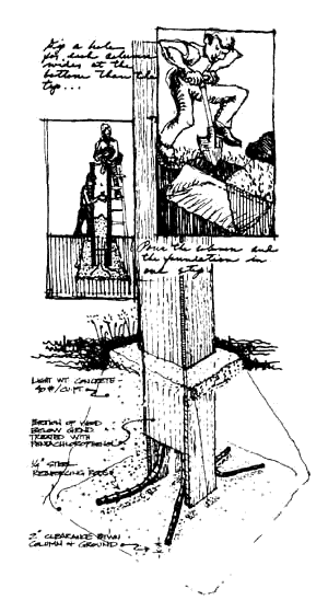 | 214 Root FoundationS . . . once you have a rough column plan for the building - Columns at the Corners (212), Final Column Distribution (213) - you are ready to start the site work itself. First, stake out the positions of the ground floor columns, before you do any other earthwork, so that you can move the columns whenever necessary to leave rocks or plants intact - Site Repair (104), Connection to the Earth (168). Then dig the foundation pits and prepare to make the foundations.