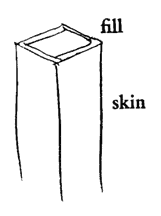 6. The column must be easy to connect to foundations, beams, and walls. Precast concrete columns are very hard to connect. So are metal columns. Brick columns are easy to connect to brick walls - not to the lighter weight skin structures required by WALL MEMBRANE (218). 7. The column must be hand nailable, and hand cuttable to make on-site modification and later repair as easy as possible. Again, current materials do not easily meet this requirement. A column which has all these features is a box column, where the hollow tube can be made as thick as is required, and then filled with a strong compressive material. Such a column can be made cheaper than comparable wood and steel columns; the outer skin can be made with a material that is beautiful, easy to repair, and soft to the touch; the column can be stiffened for bending, either by the skin itself, or by extra reinforcing; and, for structural integrity, the fill material can be made continuous with the column's footings and beams. An example of a box column which we have built and tested is a wooden box column, made with 1 inch wooden planks and filled with lightweight concrete the same density as wood, so that it has the overall volume and mass of a heavy 8 inch solid column. The drawing opposite shows these wooden box columns being made.